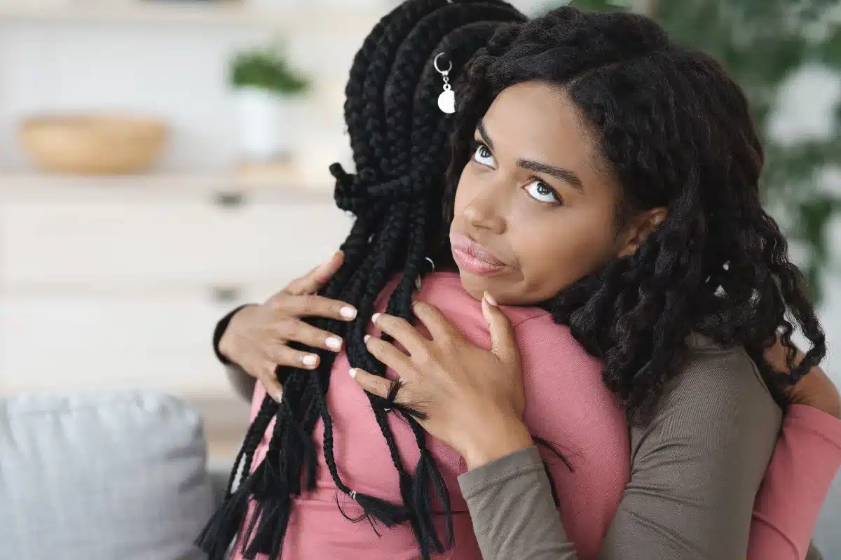 Mulher abraçando outra, mas com um olhar cético, expressando uma possível sensação de desconforto ou desconfiança.