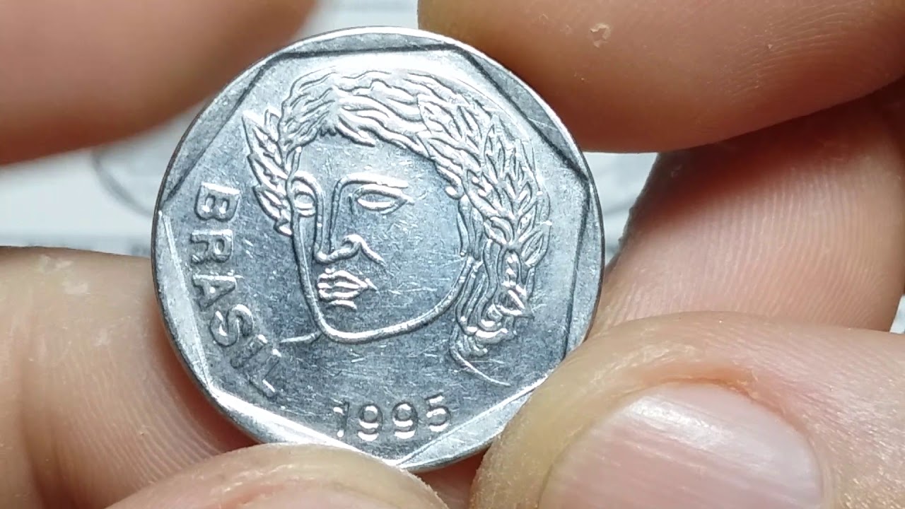 A moeda cunhada em 1995, apresenta um erro de cunhagem, conhecido como reverso horizontal e por possuir características específicas tem seu valor elevado.
