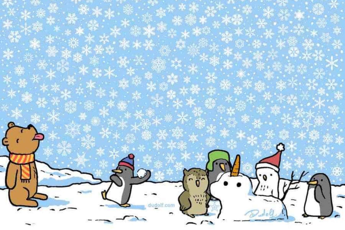 A imagem retrata uma cena de inverno cheia de flocos de neve. No canto inferior, vemos um grupo de animais fofos, incluindo um urso com cachecol, alguns pinguins, uma coruja, um boneco de neve e um pinguim usando um gorro de inverno. Todos estão envolvidos em atividades diversas, criando uma atmosfera de celebração e diversão em um cenário de neve.