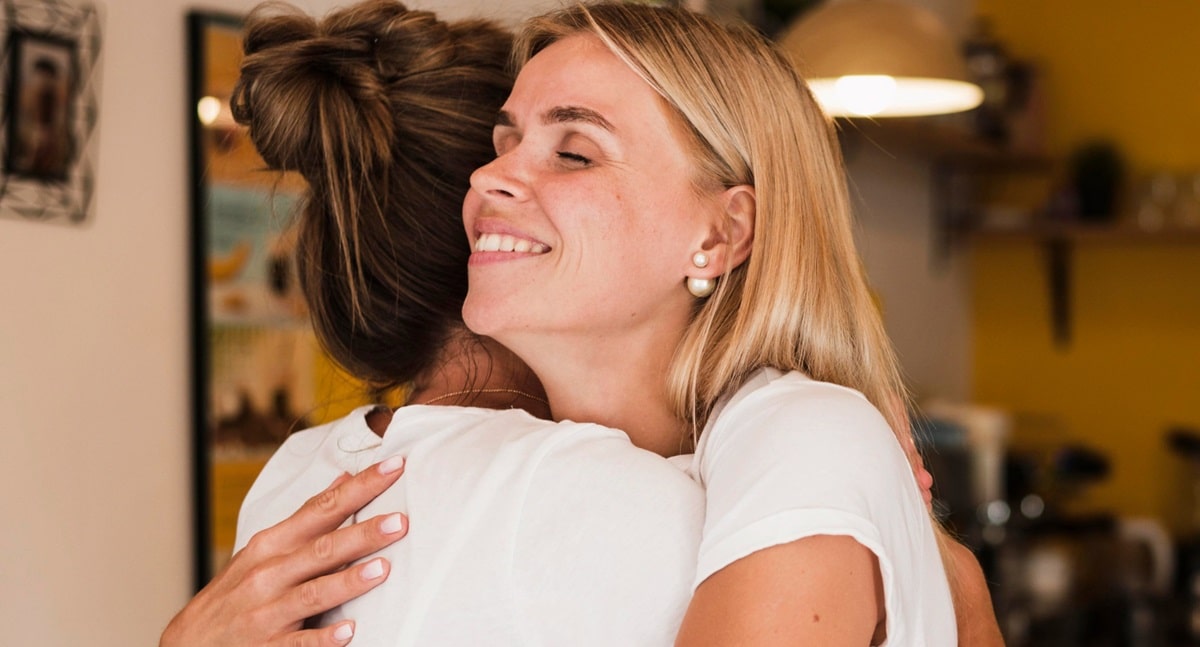Duas mulheres sorrindo e se abraçando, com um momento de conexão e amizade, em um ambiente acolhedor