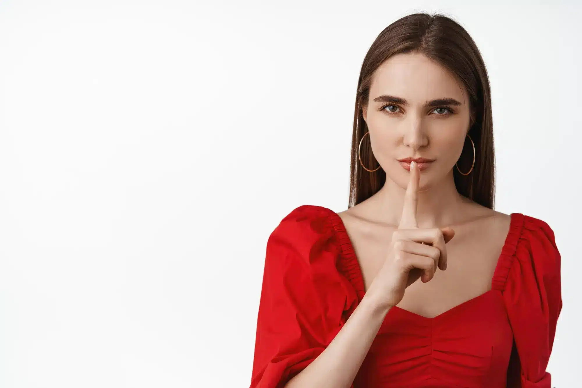 Mulher com vestido vermelho fazendo o gesto de silêncio, simbolizando o conceito de manter segredos segundo os filósofos estoicos.