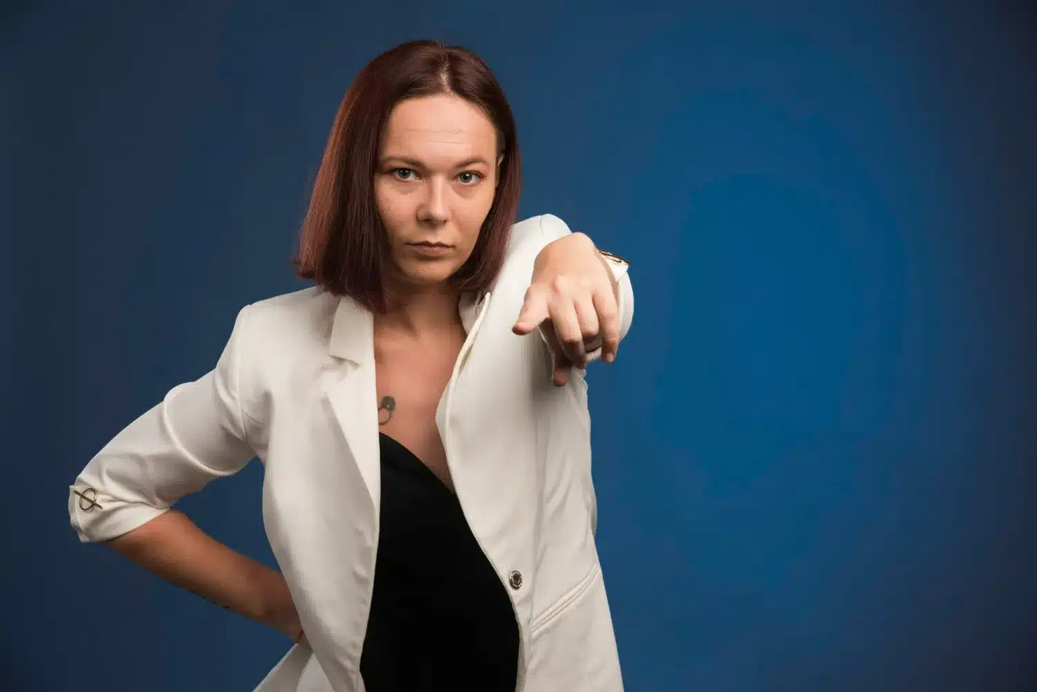 Mulher de expressão séria apontando diretamente para a câmera, vestindo blazer branco, em um fundo azul.