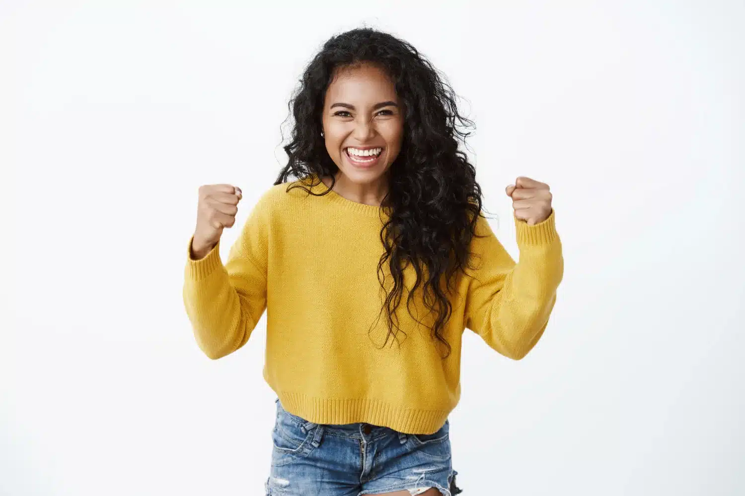Pessoa com expressão de vitória, simbolizando a criatividade e intuição.