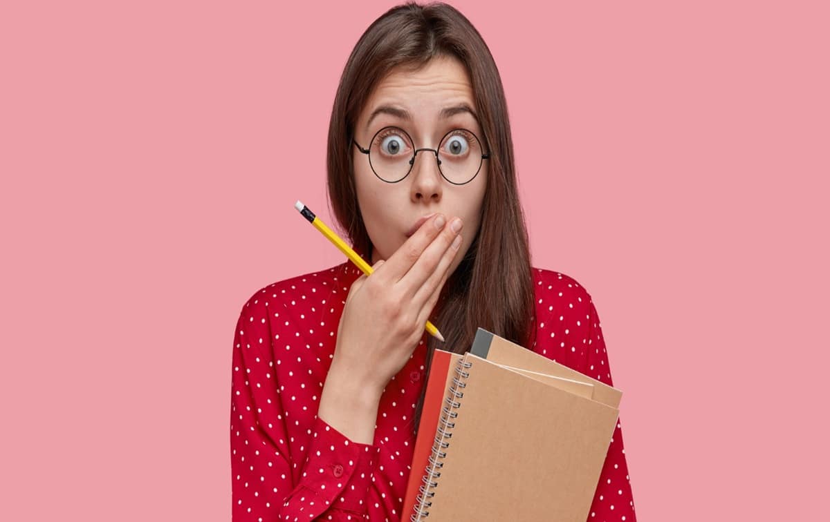 Jovem mulher com óculos redondos, expressão de surpresa e cadernos na mão, representando a dúvida comum sobre a escrita correta de palavras em português