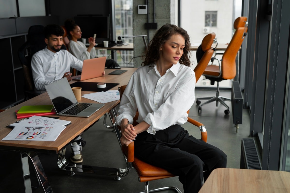 Mulher sentada em escritório olhando para o lado com expressão de julgamento, enquanto colegas trabalham ao fundo.