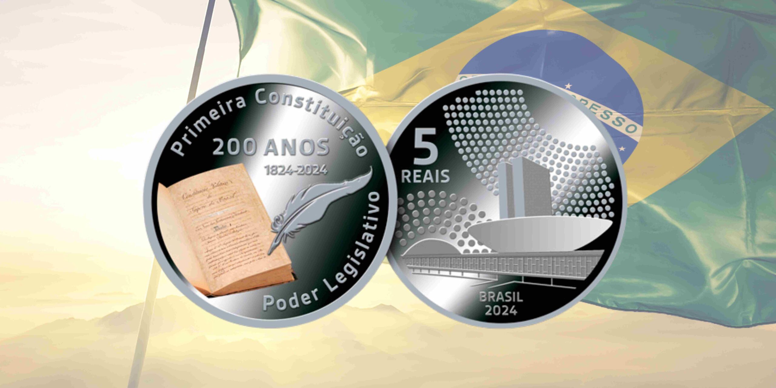 A moeda comemorativa de 5 reais, lançada pelo Banco Central do Brasil em celebração aos 200 anos da primeira Constituição e da criação do Poder Legislativo, presta uma homenagem às duas câmaras do Poder Legislativo e ao texto legal que as originou.