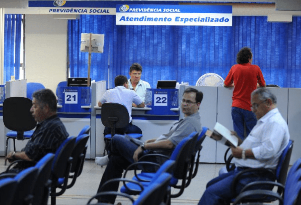 Sala de espera de agência do INSS com segurados aguardando atendimento