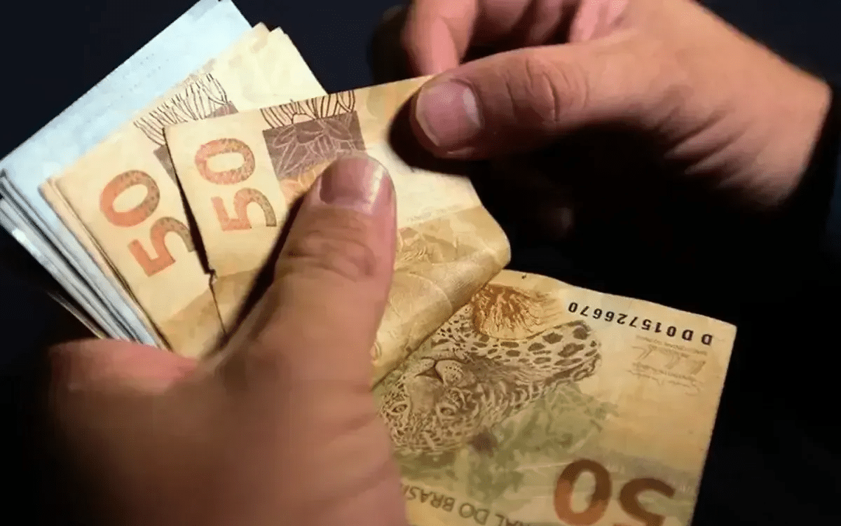 Imagem de uma pessoa segurando dinheiro em espécie, com cédulas de 50 reais, simbolizando o pagamento de um benefício como o PIX.