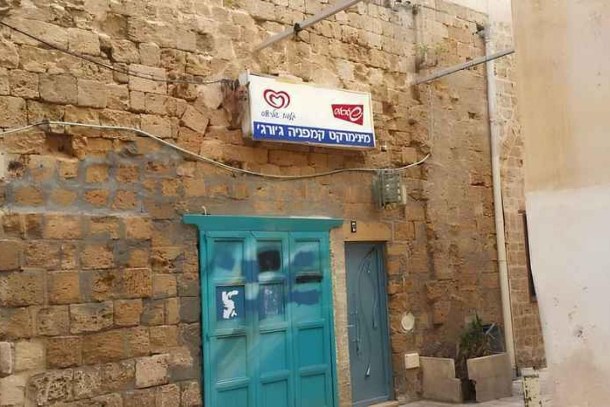 A imagem mostra uma rua estreita com construções de pedra. Há uma porta azul à esquerda e uma placa com anúncios de marcas, incluindo uma logo da Kwality Wall, acima da porta. As paredes de pedra e a arquitetura indicam que a imagem foi tirada em uma área antiga.