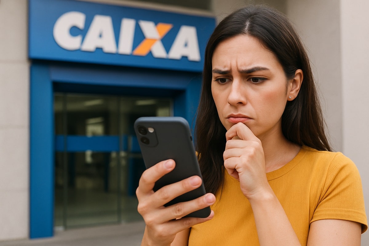 Mulher preocupada olhando para o celular em frente a uma agência da Caixa