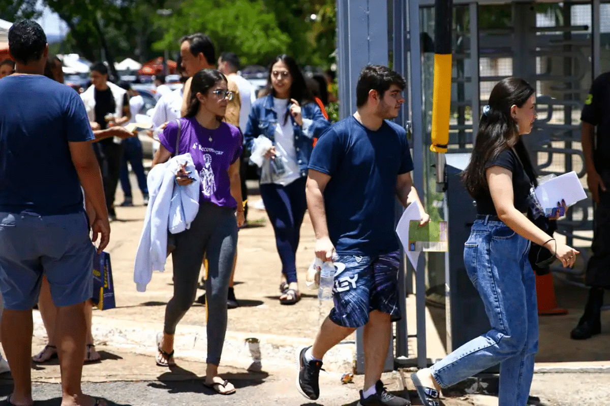 Grupo de jovens caminhando para fora do local de prova com documentos nas mãos em dia de vestibular