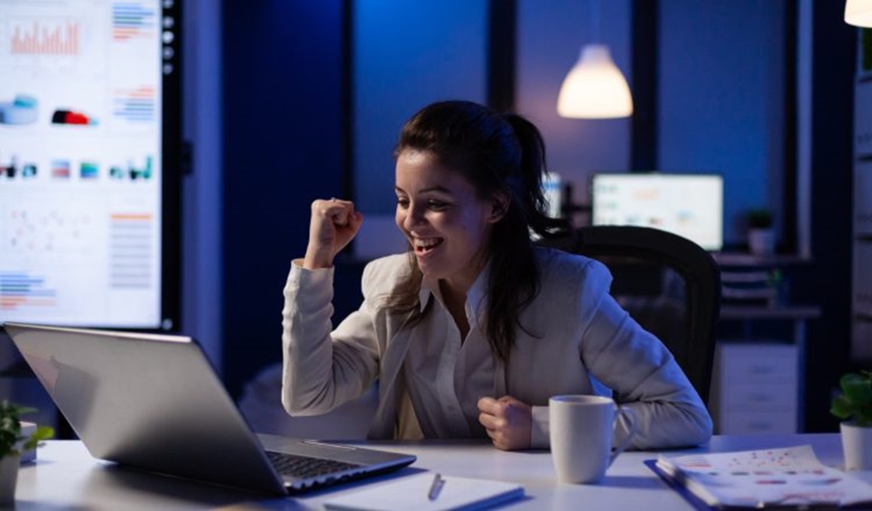 Mulher sorrindo usando notebook com notas de 100 reais ao fundo, simbolizando ganhos online.