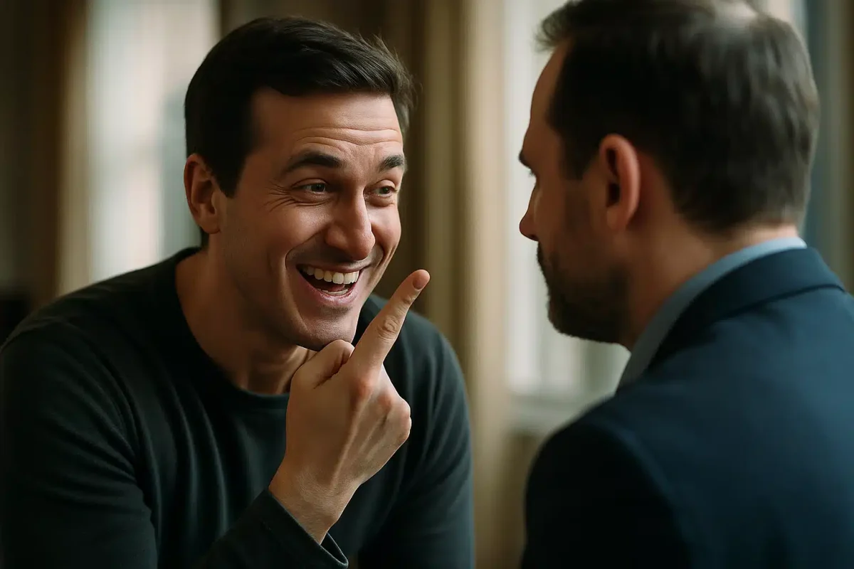 Homem sorrindo de forma irônica apontando o dedo para outro homem durante conversa