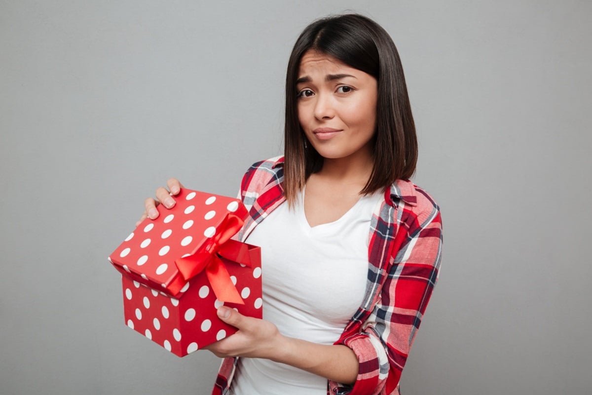 Mulher segurando um presente com expressão de ingratidão.