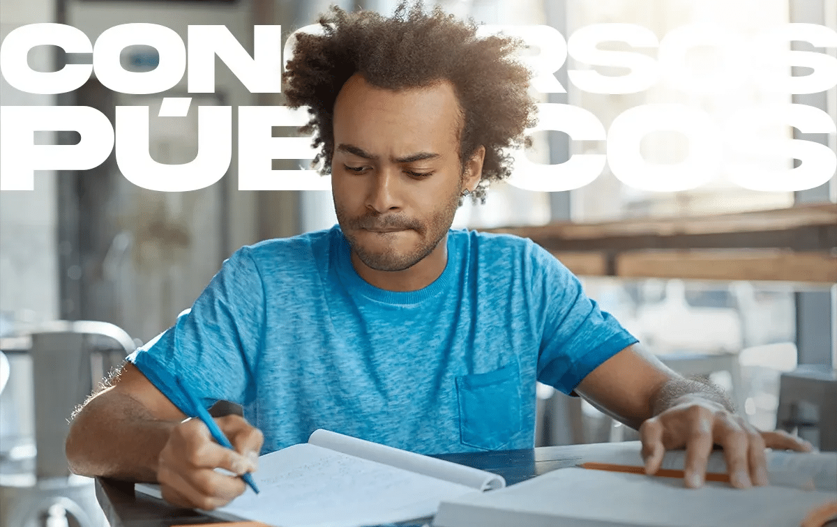 Jovem estudando concentrado para concurso público com livros e anotações.