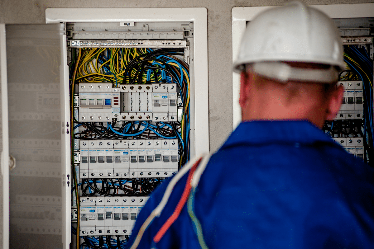 Profissional vistoriando quadro de energia com múltiplos fios e disjuntores.
