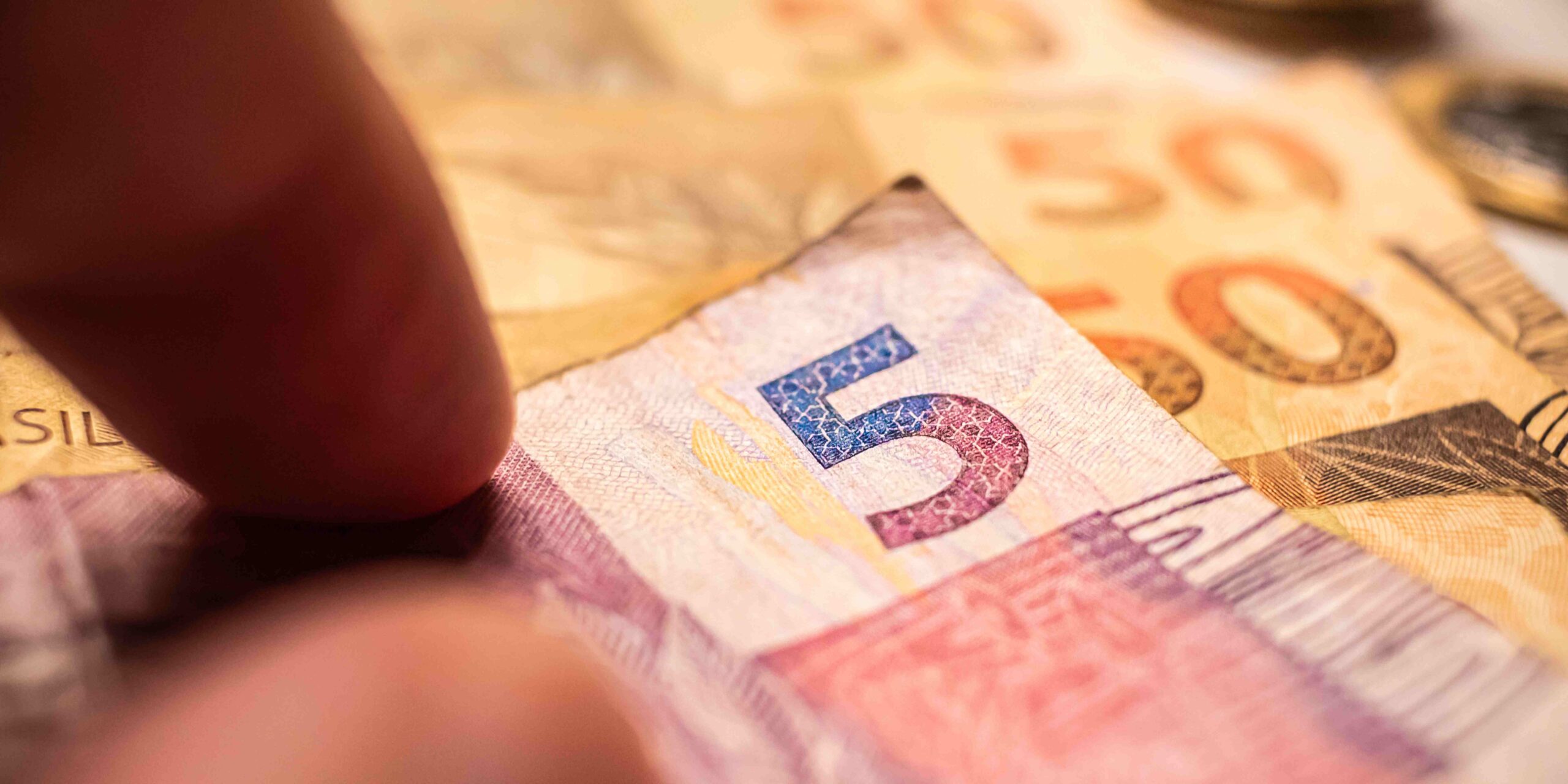 Notas de 50 reais sendo seguradas por uma pessoa, simbolizando o pagamento de benefícios sociais.
