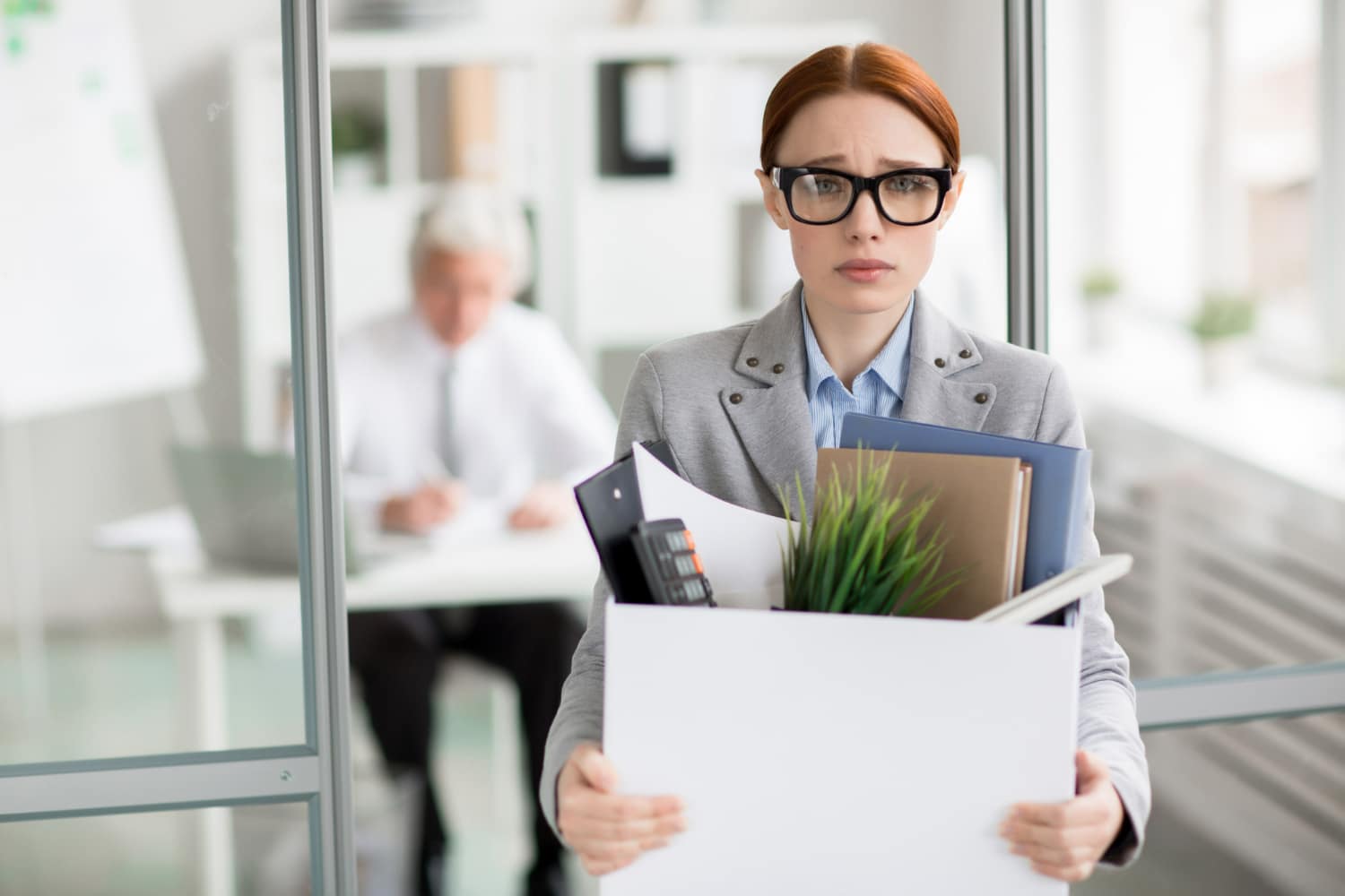 Profissional sendo demitido, segurando uma caixa com pertences pessoais em escritório.