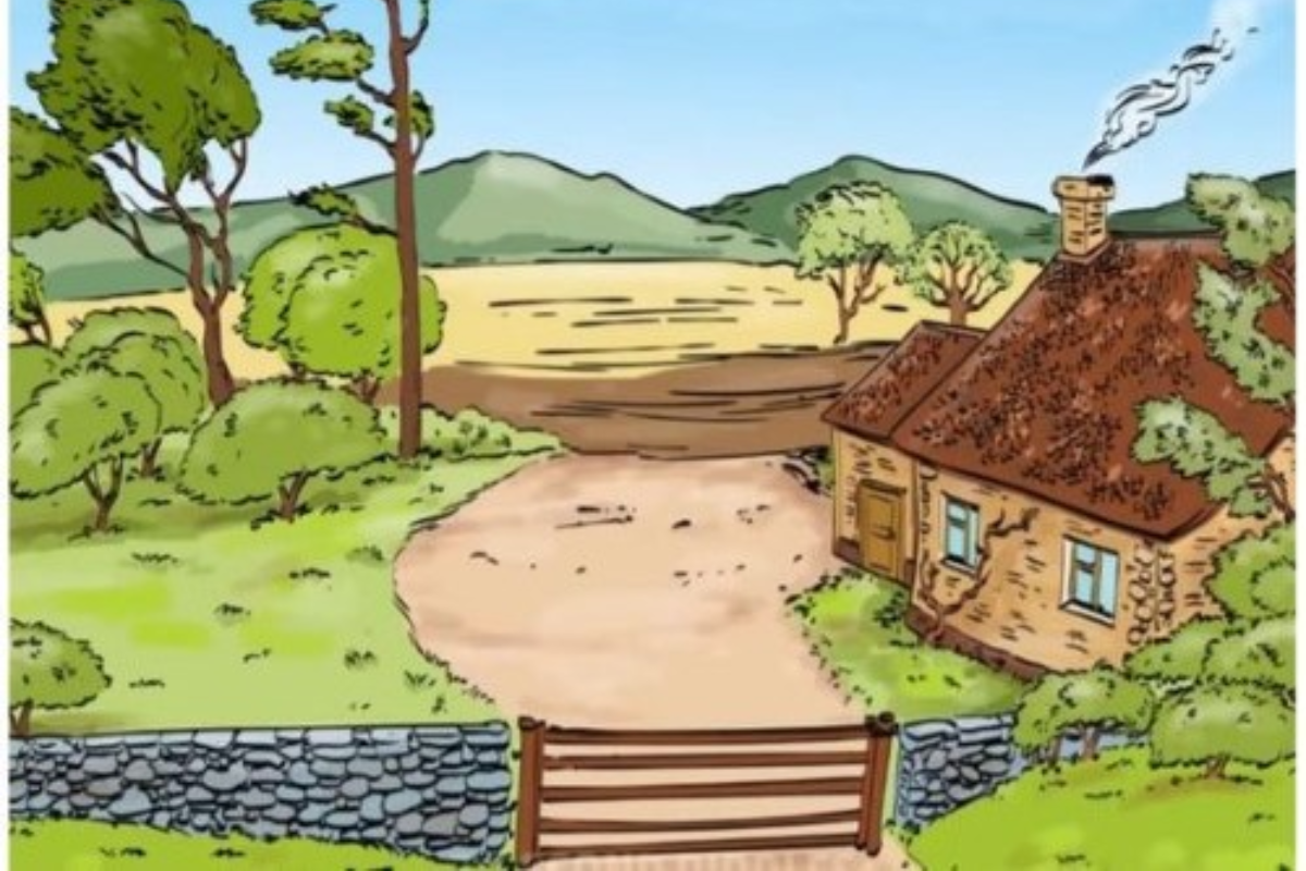A imagem mostra uma paisagem tranquila no campo, com uma casa rústica à direita, feita de tijolos e telhado de madeira envelhecida, com uma chaminé soltando uma leve fumaça. Ao redor da casa, há uma vegetação variada composta por árvores de diferentes tamanhos, com folhas em verde vibrante. A casa está cercada por um pequeno muro de pedras que se estende pelo lado esquerdo da imagem.