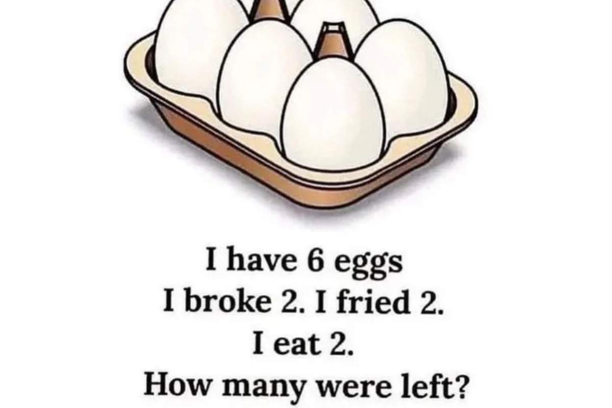 Para aqueles que ficaram curiosos, a resposta é 4 ovos. Aqui está o raciocínio: você começou com 6 ovos, quebrou 2, fritou 2 e comeu 2. Os 2 ovos que foram quebrados, fritos e comidos são os mesmos, portanto, apenas esses 2 foram usados. Assim, sobram 4 ovos intocados na cesta.