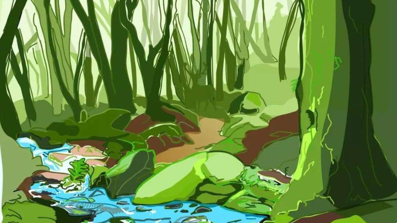 A imagem apresenta uma floresta densa com um ambiente sereno e um tanto místico. As árvores altas e esguias com troncos que variam em tons de verde e marrom criam um tapete de sombras e luzes, enquanto um pequeno riacho serpenteia suavemente pelo cenário, refletindo fragmentos do céu azul acima. A vegetação é rica e variada, oferecendo inúmeros esconderijos naturais e um habitat perfeito para a vida selvagem.