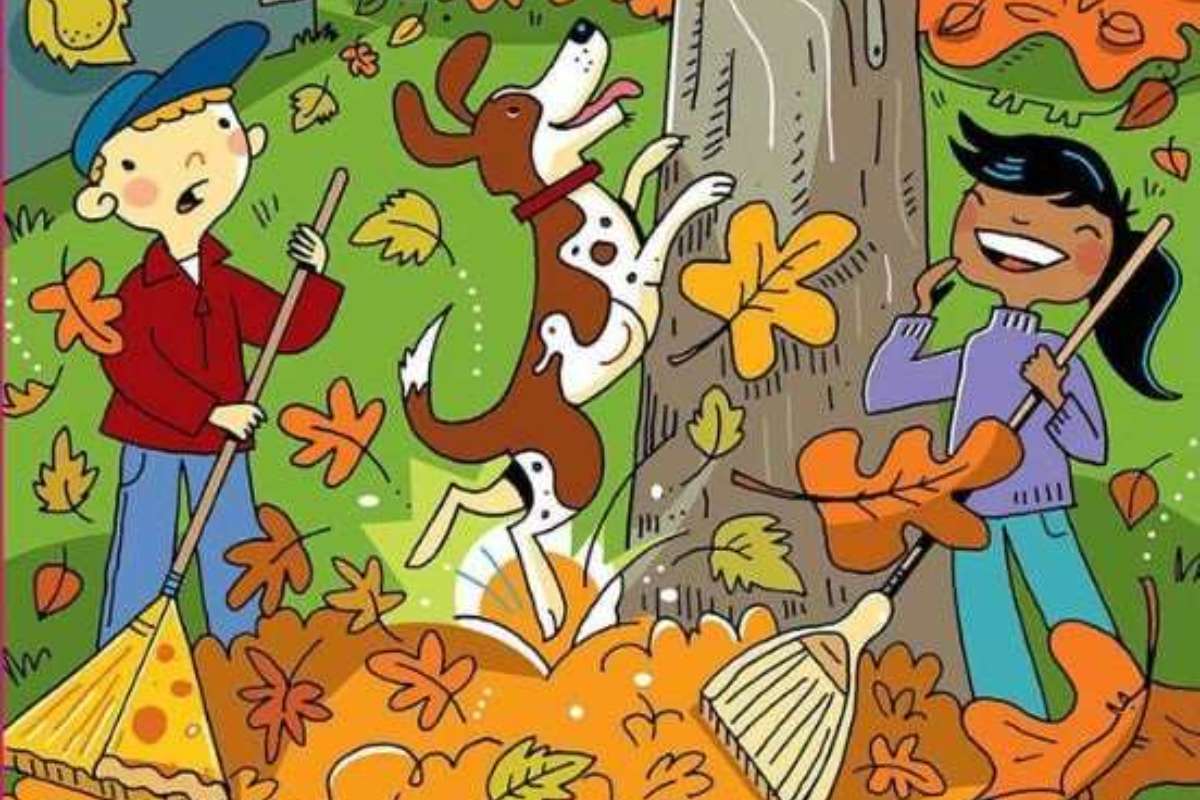Na imagem, vemos uma cena animada de crianças e um cachorro brincando e limpando um quintal no outono. As folhas laranja e amarelas caídas ao redor indicam a estação, enquanto as crianças usam vassouras para varrer as folhas. Um cachorro está em pé sobre suas patas traseiras, aparentando brincar com as folhas ou tentando alcançar algo no tronco da árvore. Há também um esquilo cinza no tronco da árvore.