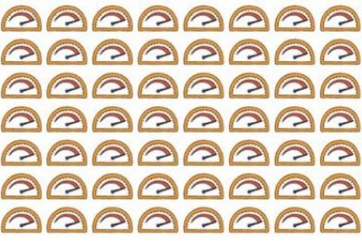 A imagem mostra uma matriz de emojis de velocímetros dispostos em linhas e colunas. Cada velocímetro tem um formato semicircular com uma agulha indicando uma certa velocidade. Todos os velocímetros parecem muito semelhantes à primeira vista, mas há um velocímetro que é diferente dos outros, exigindo um olhar atento para ser identificado.