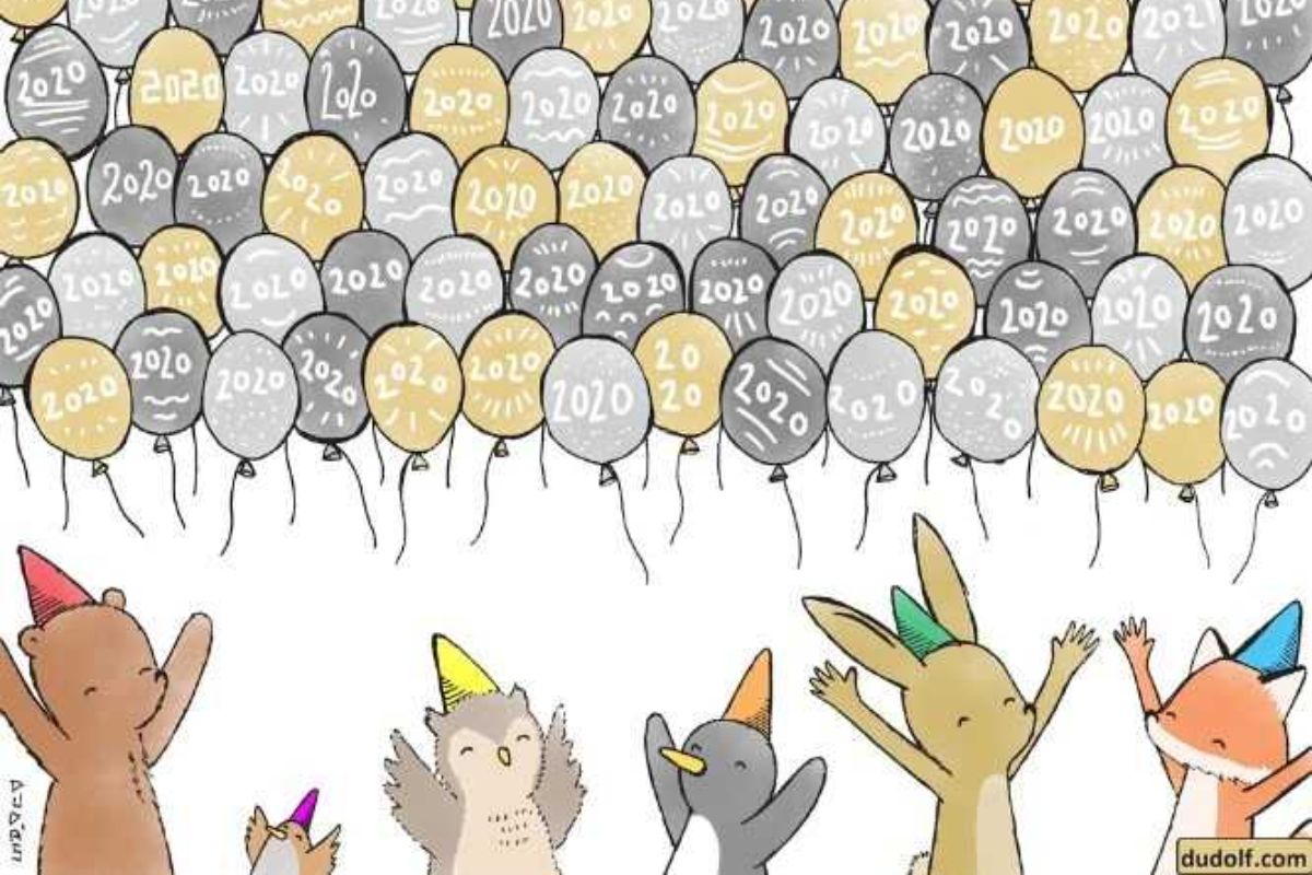 Na imagem, vemos uma cena festiva cheia de balões com o número “2020” escritos neles. Os balões são predominantemente em tons de cinza e dourado, e estão dispostos de forma densa, cobrindo quase toda a área superior da imagem. Na parte inferior, alguns animais de festa – incluindo um urso, uma coruja, um pinguim, um coelho e uma raposa – estão usando chapéus de festa e parecendo se divertir muito, olhando para os balões.