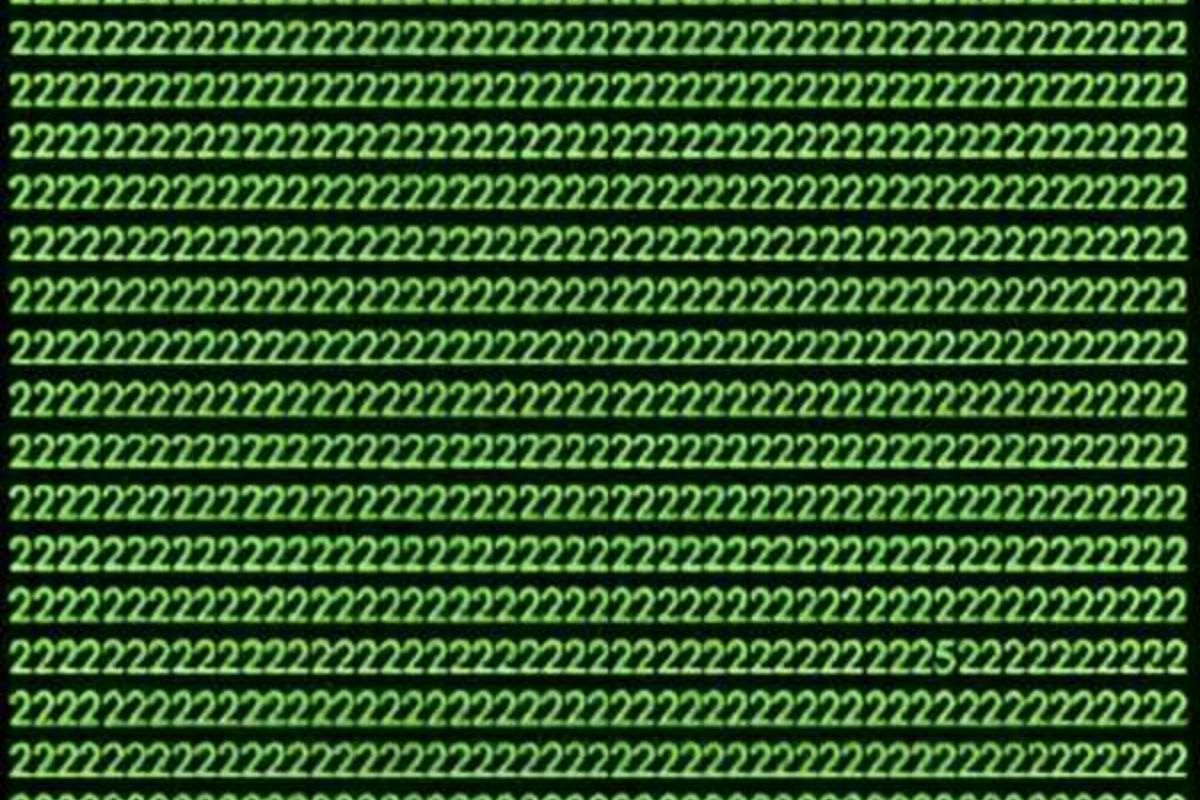 A imagem apresenta uma grade composta por várias linhas e colunas de números “2” dispostos de forma organizada. Todos os números são verdes e estão dispostos de maneira a criar um padrão repetitivo que pode confundir o olhar. No entanto, escondido entre esses números “2”, há um único número “5” que se diferencia dos demais.
