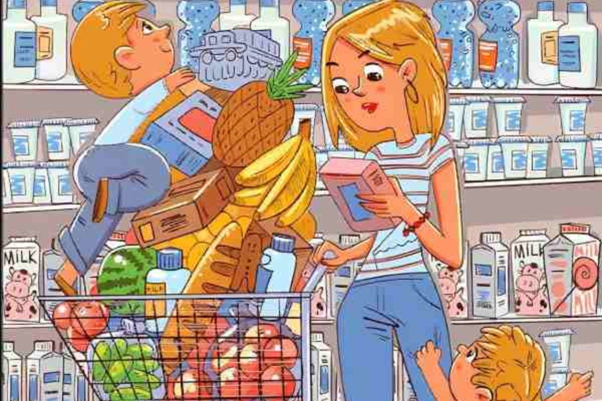 Na imagem, vemos uma mãe com seus dois filhos em um supermercado. Eles estão fazendo compras e o carrinho está cheio de produtos variados, incluindo frutas como abacaxi e melancia, caixas de leite, garrafas de água, e outros itens. No fundo, há prateleiras repletas de caixas de cereais, garrafas de leite e outros produtos.