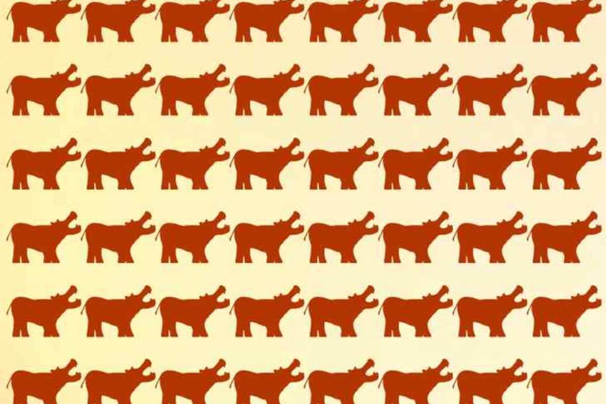 A imagem mostra uma grade composta por diversas silhuetas de hipopótamos em uma cor marrom-avermelhada, organizados em várias linhas e colunas. Entre essas figuras, há um único rinoceronte escondido, camuflado de forma sutil entre os hipopótamos, tornando o desafio ainda mais interessante.
