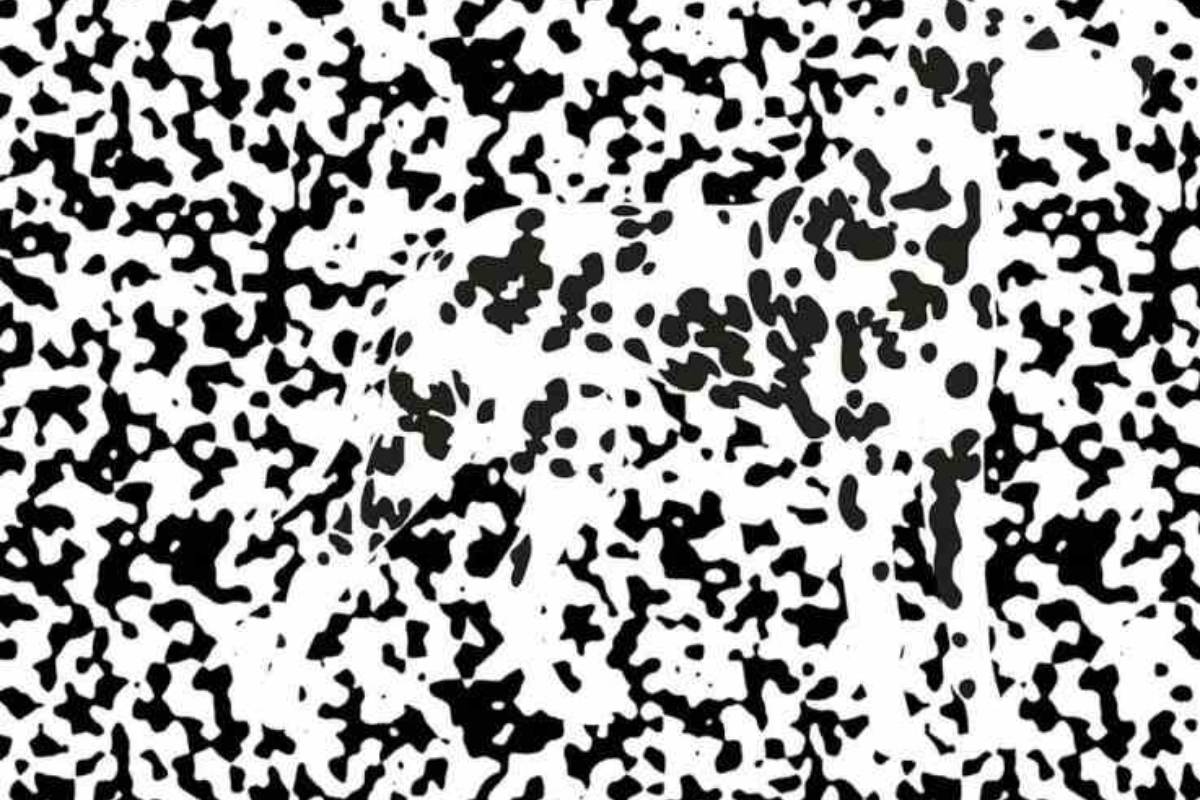 Tire um momento para examinar cuidadosamente as manchas pretas e brancas. A figura do cachorro está camuflada entre os padrões, e somente aqueles com excelente percepção visual serão capazes de identificá-lo rapidamente.