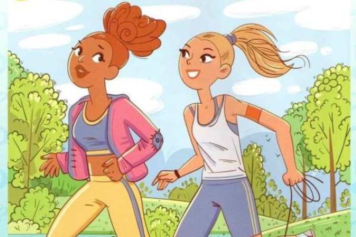 A imagem mostra duas mulheres correndo em um parque verdejante, acompanhadas por um cachorro animado. A mulher à esquerda está vestindo uma calça amarela e um casaco rosa, enquanto a mulher à direita está usando um conjunto de shorts e camiseta em tons de azul e branco. O cachorro, um buldogue branco com manchas marrons, parece estar feliz e cheio de energia.