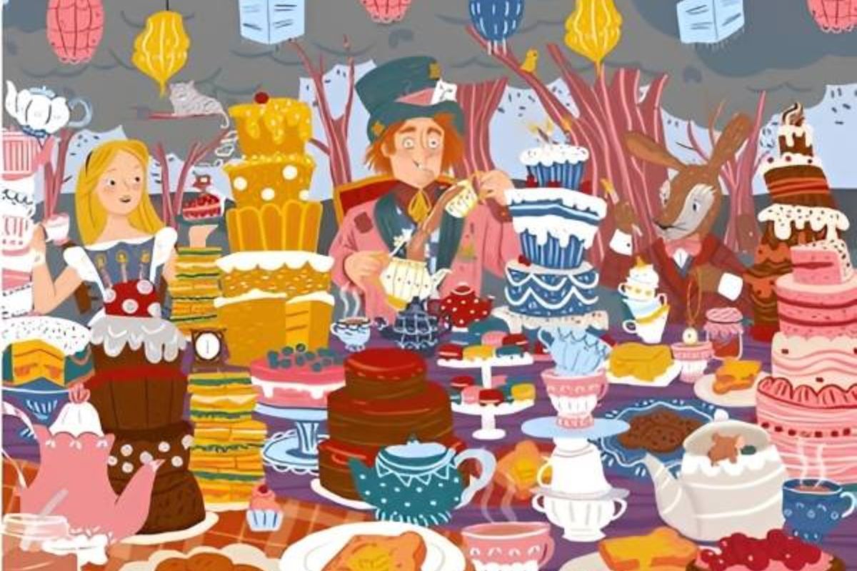 Na imagem, vemos uma cena festiva de um chá da tarde com muitos detalhes vibrantes e coloridos. Há várias mesas cobertas com uma variedade de bolos, tortas e xícaras de chá. Duas pessoas estão presentes na imagem: uma garota loira com um vestido azul claro e um chapéu, e um homem com um chapéu extravagante e roupas coloridas, provavelmente representando personagens de “Alice no País das Maravilhas”.