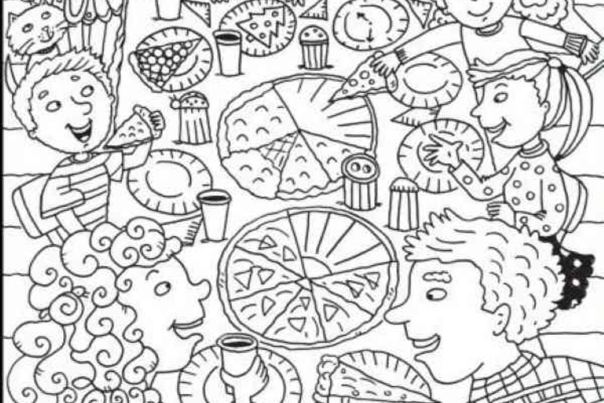 Na imagem, vemos uma cena animada de uma festa de pizza. Diversas pessoas, incluindo adultos e crianças, estão sentadas ao redor de uma mesa grande cheia de pizzas de diferentes sabores. Todos parecem estar se divertindo, com sorrisos no rosto e fatias de pizza nas mãos. A mesa está repleta de detalhes, como copos, pratos, guardanapos e pedaços de pizza. Há também uma variedade de alimentos e bebidas dispostos na mesa.