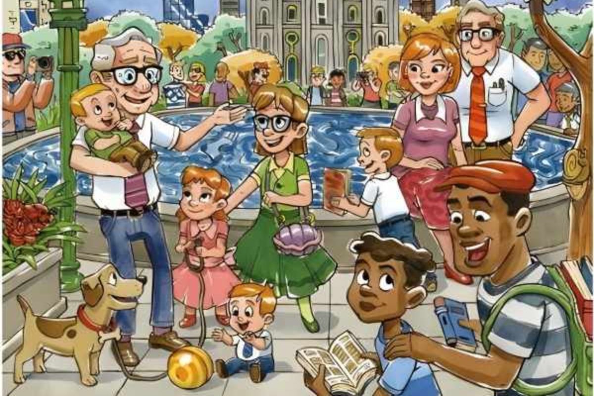 A imagem mostra uma cena animada em um ponto turístico, onde várias pessoas estão se divertindo e tirando fotos em frente a uma fonte e um grande edifício histórico. Há adultos, crianças, um cachorro e até alguns pássaros na cena. A atmosfera é de alegria e diversão, com todos aproveitando o dia.
