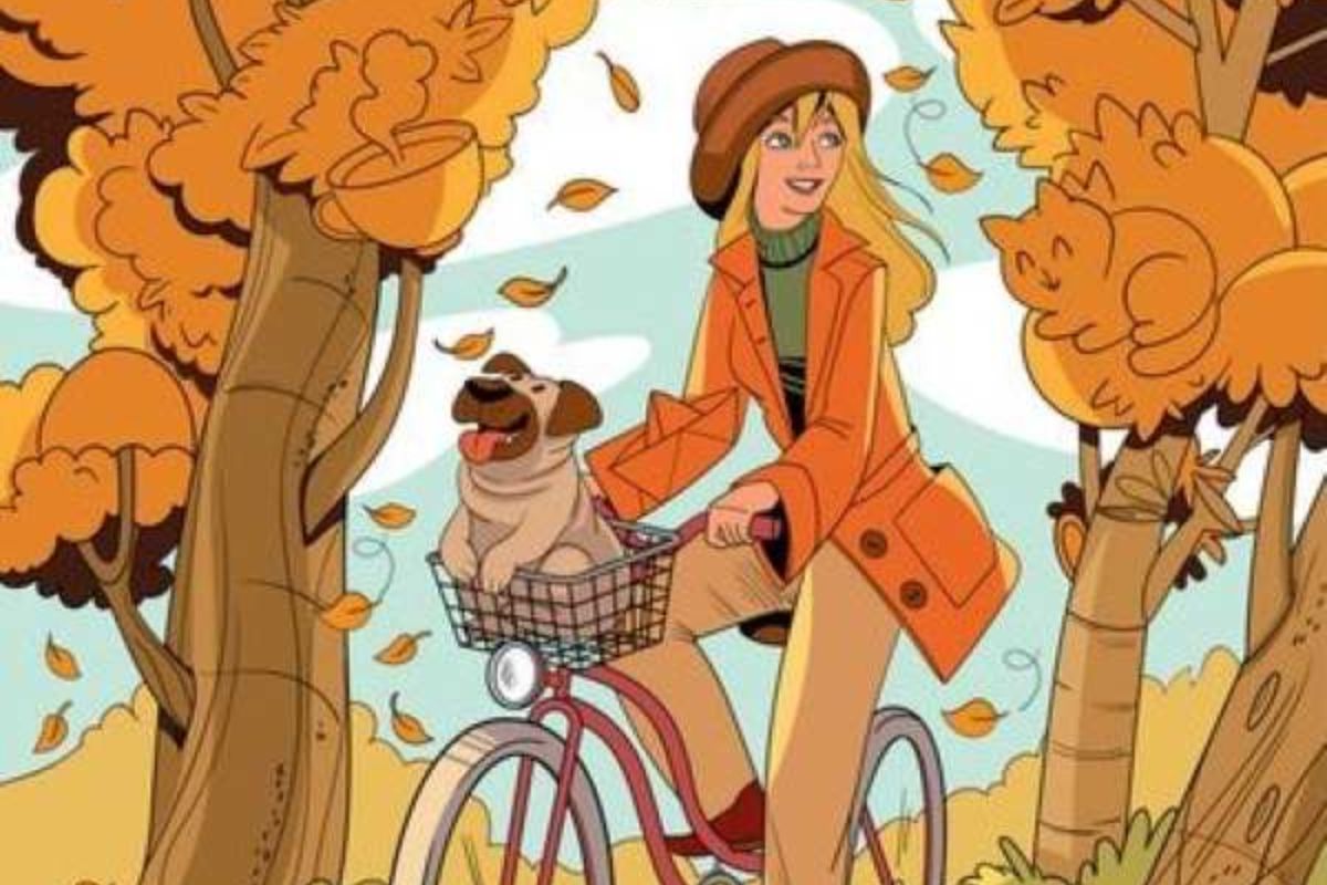 Na imagem, vemos uma cena encantadora de outono. Uma jovem mulher está andando de bicicleta por um caminho repleto de folhas caídas. Ela está vestida com roupas de outono, incluindo um casaco laranja e um chapéu marrom. Na cesta da bicicleta, há um cachorro feliz, aproveitando o passeio. Ao fundo, as árvores exibem folhas de outono em tons vibrantes de laranja e amarelo, criando uma atmosfera acolhedora e colorida.