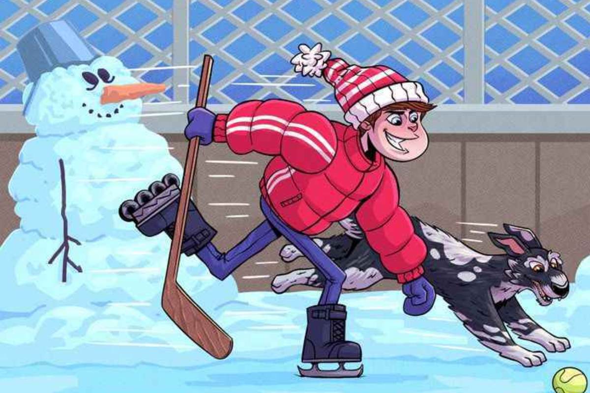 Na imagem, vemos um cenário de inverno com um menino alegre patinando no gelo, acompanhado por um cachorro que corre ao seu lado. O garoto está vestido com um gorro de lã listrado em vermelho e branco, um casaco grosso vermelho, luvas e patins de gelo. Ele segura um taco de hóquei enquanto patina, e o cachorro parece estar muito animado, correndo ao lado dele, com as orelhas levantadas e uma bola de tênis próxima a ele. Ao fundo, um boneco de neve sorri, com um balde azul na cabeça e uma cenoura como nariz.