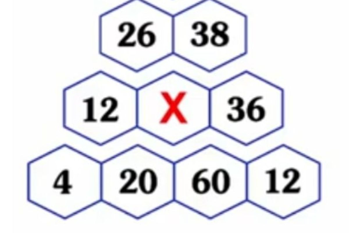 Na imagem, vemos um quebra-cabeça numérico em formato de pirâmide. Os números são organizados em hexágonos que formam três camadas. Na base da pirâmide, temos os números 4, 20, 60 e 12. Na camada intermediária, estão os números 12 e 36, com um hexágono vazio marcado por um “X”, indicando o número que falta. No topo da pirâmide, encontramos os números 26, 38 e, no vértice superior, o número 32.