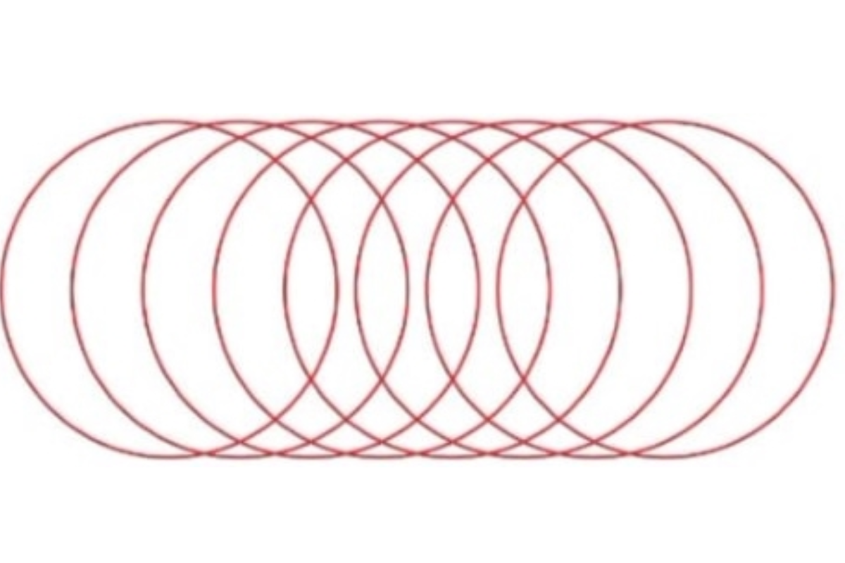 A imagem apresenta uma sobreposição de círculos delineados em cor vermelha, criando uma ilusão visual interessante. Cada círculo parece se conectar de forma precisa com os outros, criando uma sequência contínua de interseções ao longo da imagem. À primeira vista, os círculos parecem se entrelaçar de forma simétrica, mas é um desafio contar exatamente quantos estão presentes.