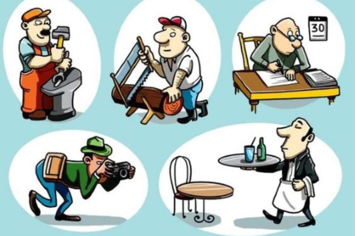 Na imagem, vemos cinco personagens em diferentes atividades profissionais. À primeira vista, todos parecem realizar tarefas comuns, mas o desafio aqui é identificar quem é canhoto. Temos um fotógrafo, um garçom, um ferreiro, um marceneiro e um funcionário de escritório.