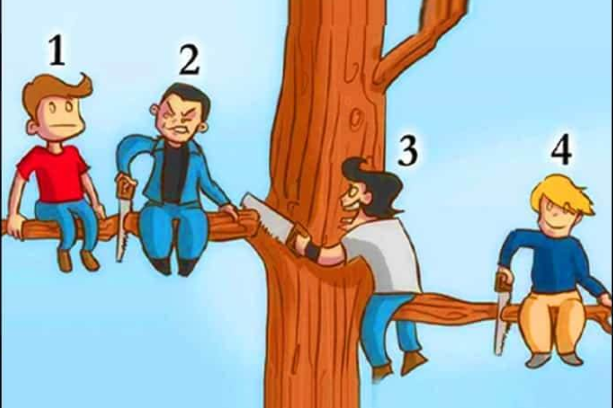 - Foque nas ferramentas – Três dos homens estão usando serras, mas nem todos estão cortando o próprio galho. Preste atenção em quem está agindo de forma mais imprudente.