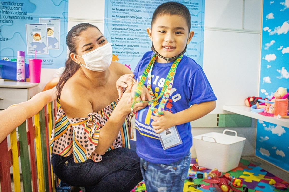 Menino usando cordão de girassol com identificação, acompanhado por mulher com máscara em ambiente de brinquedos.