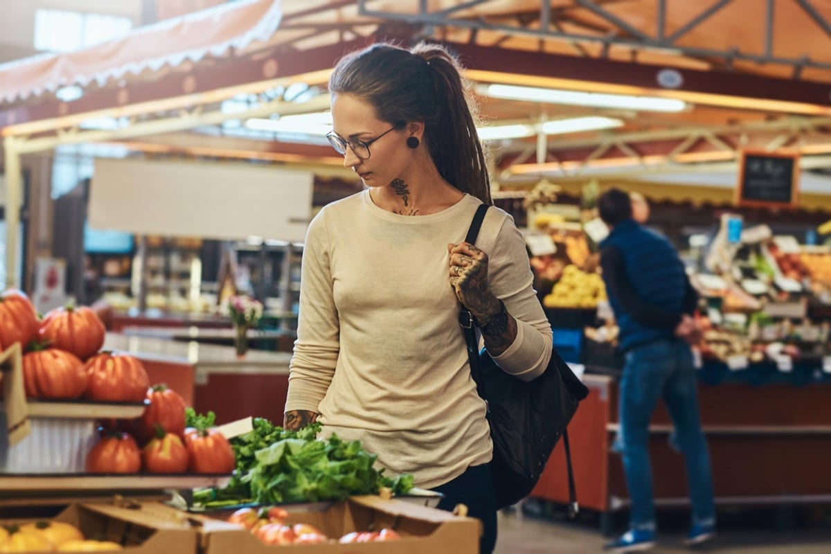 Mulher comprando verduras frescas em feira ou mercado coberto após queda de preços da cesta básica em setembro