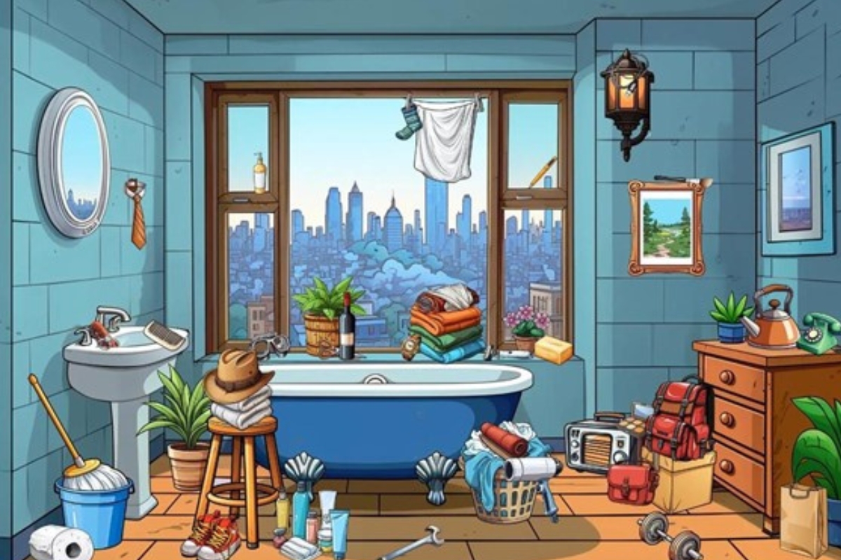 Logo abaixo, você pode ver um banheiro completamente bagunçado com objetos espalhados por todos os lados do ambiente. Nessa cena, você deve pensar que é difícil imaginar a localização de uma tesoura, não é mesmo? No entanto, o título afirma que o objeto precisa ser encontrado em 10 segundos para que se obtenha sucesso nesse tipo de tarefa. Então, seja rápido:
