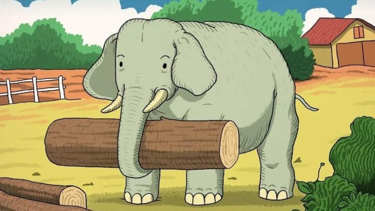 Na imagem apresentada, vemos uma cena tranquila, com árvores e céu claro, além de um elefante carregando um tronco de madeira. A paisagem é agradável aos olhos, mas será que você consegue ver algo mais? Como indicado pelo desafio, há um cavalo escondido nesse cenário. Sua missão é localizá-lo o mais rápido possível.