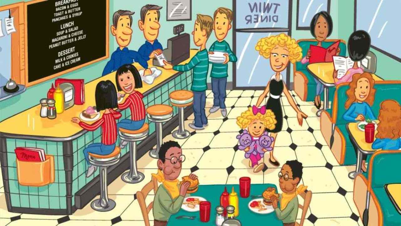 Em outras mesas, pessoas desfrutam de refeições em um cenário típico de “diner” americano. O piso quadriculado preto e branco completa o ambiente, e o taco de beisebol está estrategicamente escondido entre esses elementos na cena, esperando para ser encontrado em apenas 8 segundos. Preparado?