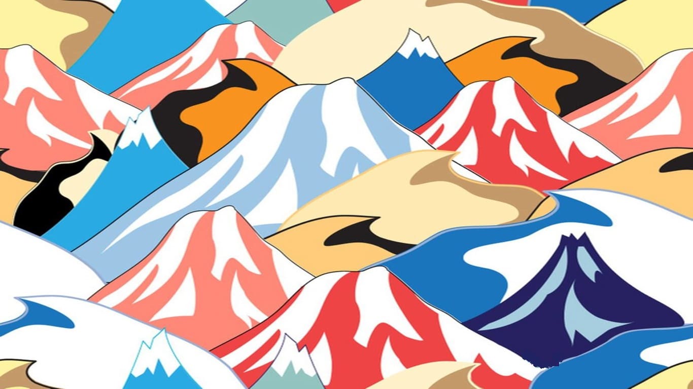 Ilustração colorida de montanhas estilizadas com um panda escondido entre elas