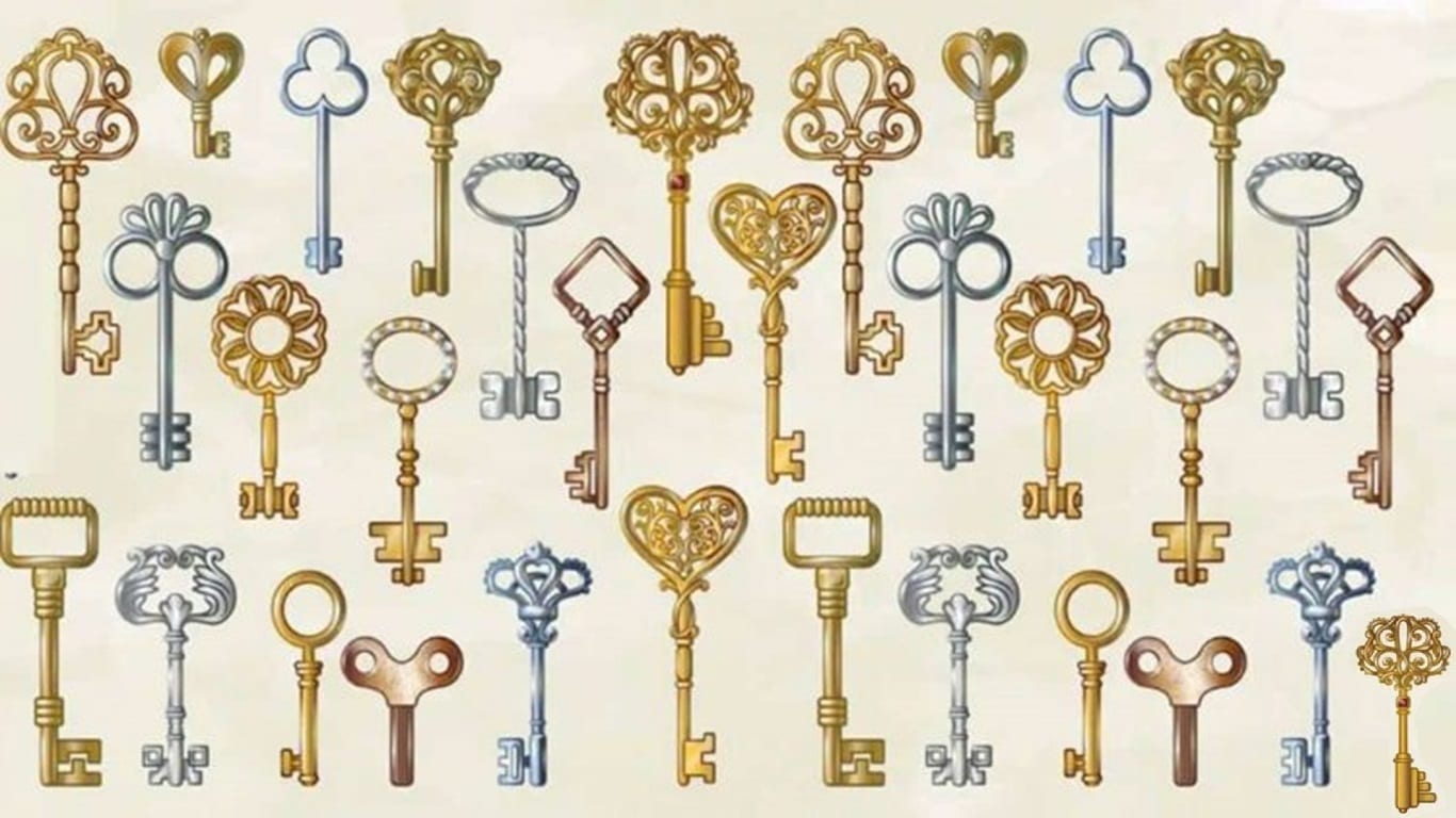 Para superar esse desafio, é necessário um olhar atento e uma boa percepção de detalhes. Em meio a uma variedade de chaves antigas, ornamentadas com estilos dourado e prateado, apenas uma se destaca como única e sem cópia. A ilustração foi projetada para enganar os olhos e testar a capacidade de concentração do participante, que terá apenas 15 segundos para identificar a chave singular. É um teste instigante que combina raciocínio lógico e velocidade, desafiando os limites da observação e da tomada de decisão rápida.