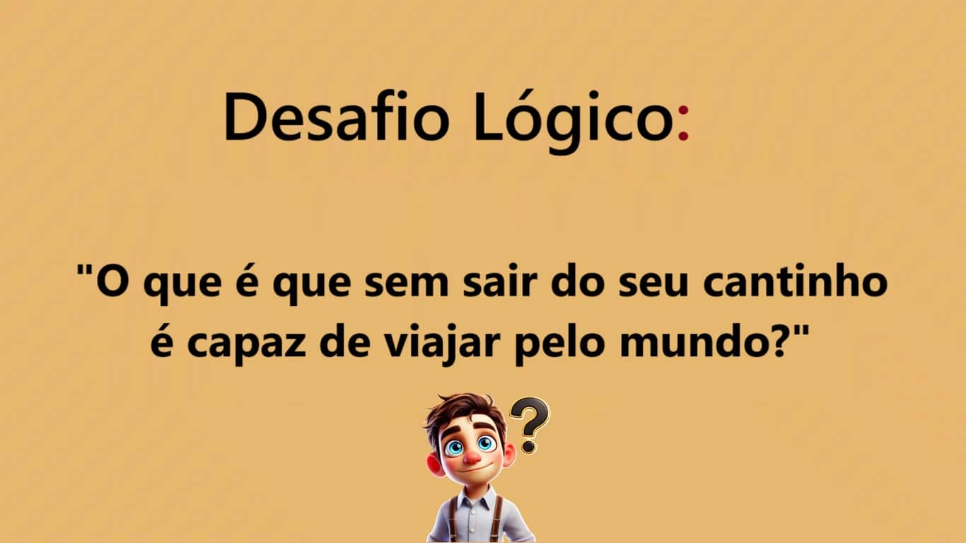 Desafio lógico com pergunta intrigante sobre algo que viaja sem sair do lugar, acompanhado de personagem pensativo.